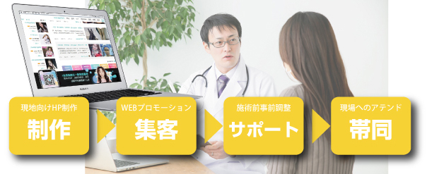 当サービスでは、WEB制作事業及び海外における広告プロモーション事業を得意としております。そのニーズをマッチングさせるため現地言語のホームページを作成し、そのホームページからプロモーションを行い、患者様の集客、医療現場への案内・手続き、患者の渡航手配、医療現場へのアテンド・医療通訳派遣、診療書類の翻訳まで一括で代行致します。