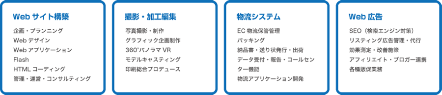 Webサイトの企画・プランニング、ECサイトでは制作~販促~商品管理~発送まで、ワンストップサービスにより低コストで高品質のパフォーマンスを発揮いたします。 また、飲食店などの店舗運営では、様々な業務を一元的に管理できるアプリケーションツールを導入いただくことで業務を包括的に連携・管理できます。 スタッフがリアルタイム情報共有し、業務の効率化・省力化はもちろん、情報の透明化やミスの防止、スムーズな連携による現場力の向上を実現します。 さらに、各種データを蓄積・分析を通じて、今後の改善施策や経営判断にも活用できるプラットフォームとして機能します。